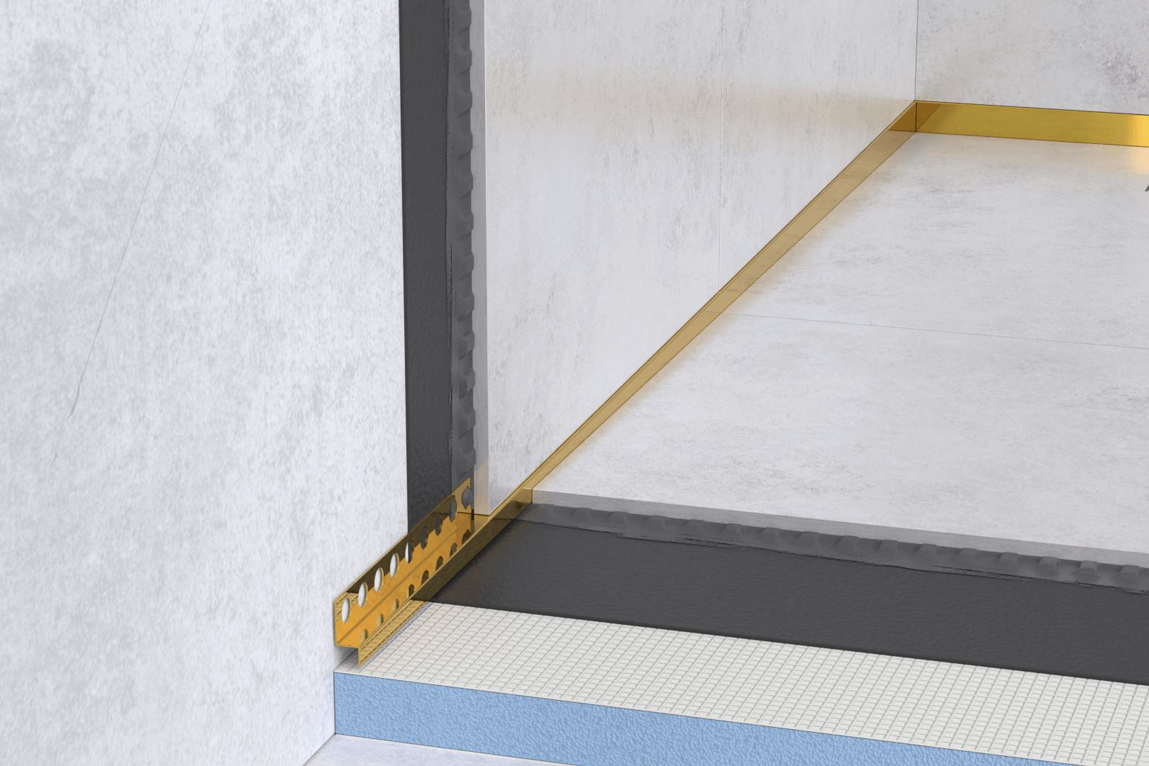 Le profilé incliné définit une inclinaison de 2%. L’inclinaison restera intact lors de découpage du profilé pour chaque mesure donnée – cela permet d’obtenir un produit adapté et personnalisable qui répond au besoin de chacun. La partie frontale du profilé présentée s’élargit vers la bonde, la base reste inchangée – grâce à cela il ne faut plus découper les carreaux.